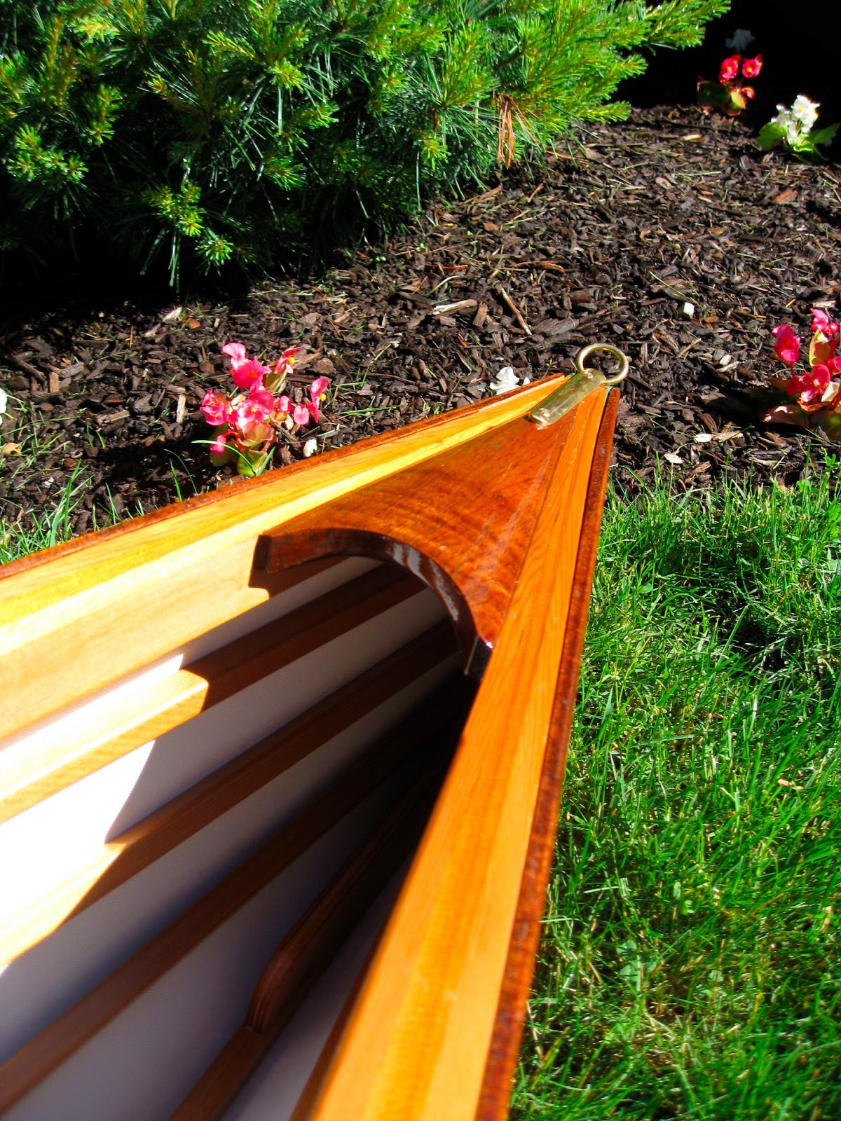 The boat the Mr. Canoez built , “I like the traditional shapes from wood and canvas canoes and took some cues from the class I took with Jerry Stelmok in tapering the gunwales and the shapes for the decks – curved with a hollow back – and the brass stem band and painter loop on bow and stern.”