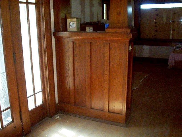 Going into the dining room you see some dashed lines. These are the craftsman style beams on the ceiling. The two rectangular items as you enter the dining room are cabinets. They have a tapered column on each one that goes the beam on the ceiling. These photos are from the house we first looked at and that motivated us to build a Craftsman Cottage. This photo shows the back of the cabinets. On the other side are double glass doors.